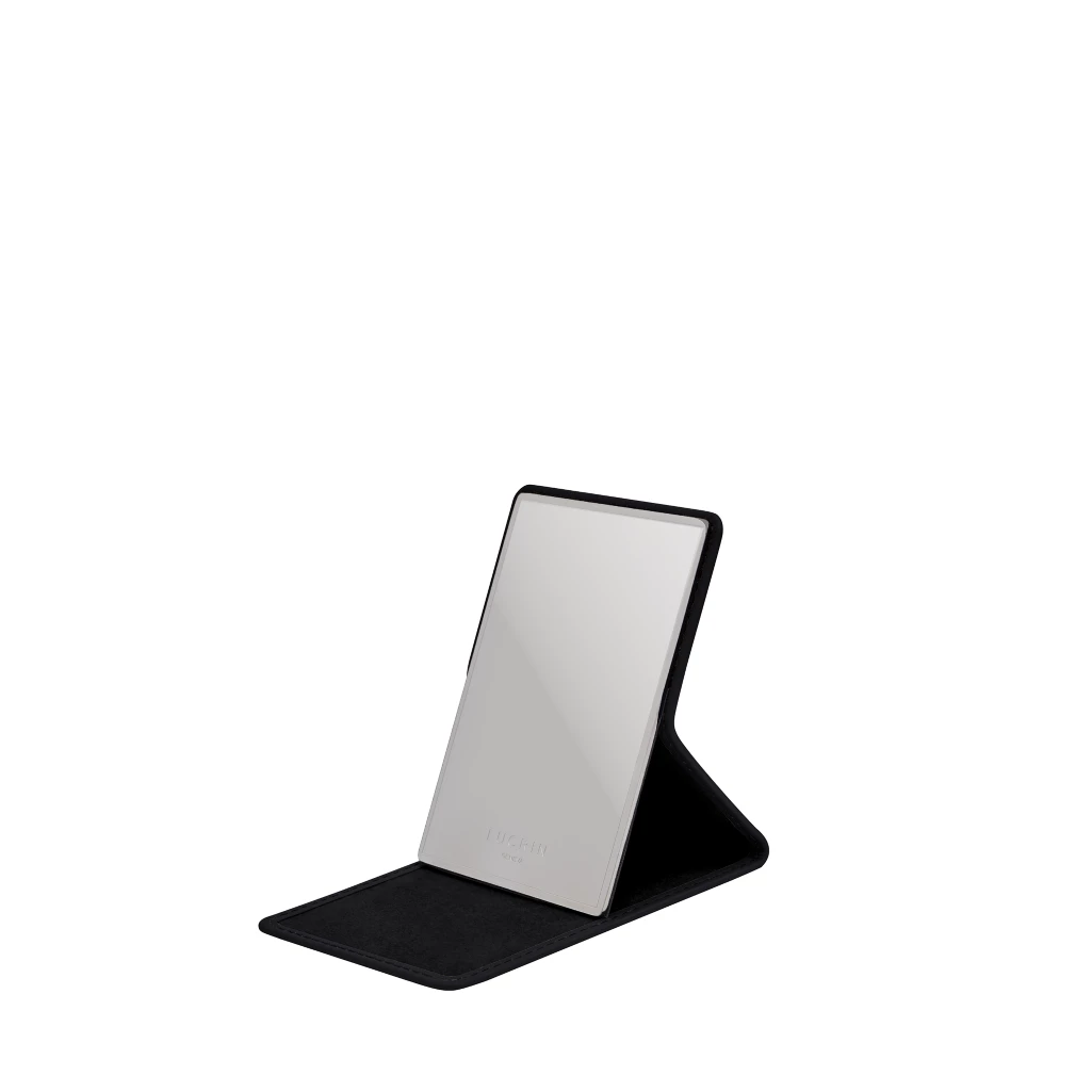 Dieser edle Taschenspiegel besteht aus einer hochwertigen, spiegelnden Metallplatte in Kombination mit Premium-Leder zum Schutz und für eine elegante Ästhetik. Der meisterhaft designte Taschenspiegel aus Metall steht von allein, da der feste Lederteil sich zu einem anpassbaren Ständer aufklappen lässt. Die Innenseite besteht aus Mikrofaser und schützt den Spiegel, wenn er geschlossen ist. Der schmale, rechteckige Metallspiegel besitzt genau die richtige Größe und passt bequem in Ihre Tasche, Ihr Kosmetiktäschchen oder Ihre Jackentasche. Natürlich können Sie dem Spiegel mit einer Personalisierung einen einzigartigen Look verleihen und zum Beispiel Ihre Initialen darin eingravieren lassen.